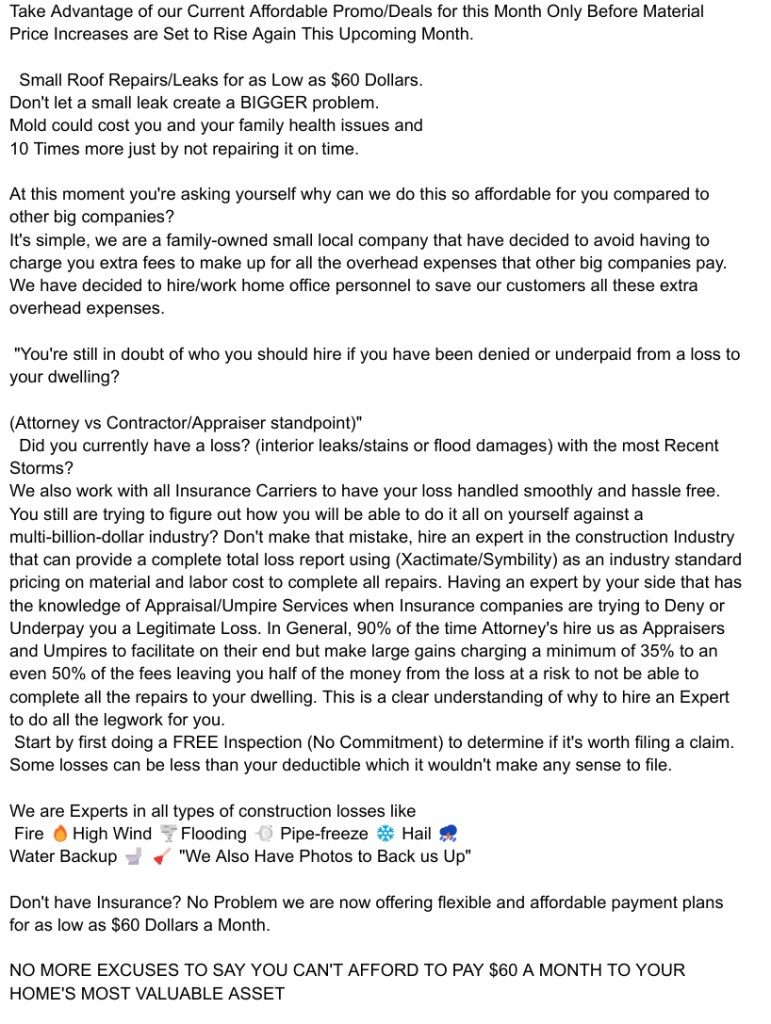 Comprehensive Inspections: We uncover visible and hidden damage—backed by the same software (Xactimate) used by insurance companies, but with far more skill and honesty. Guidance Through Claims: Our appraisers prepare bulletproof documentation and walk you step-by-step through the insurance process.
